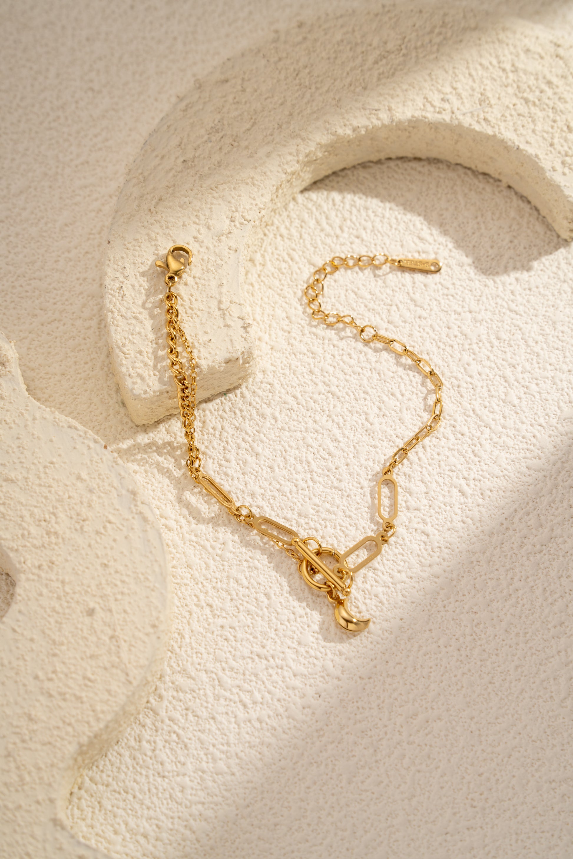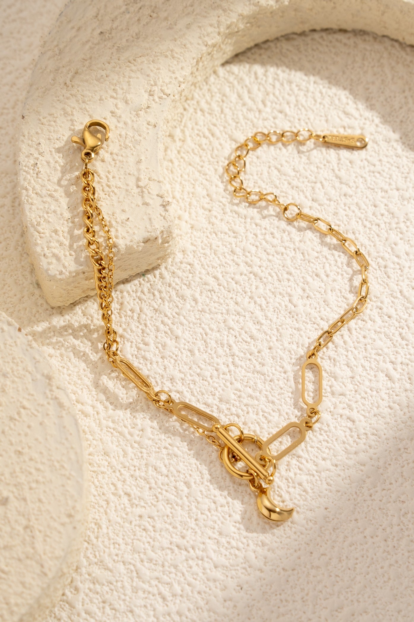 Ce bracelet doré joue sur un dégradé subtil de mailles, mêlant finesse et caractère. Une breloque lune, délicatement suspendue qui incarne élégance et douceur nocturne. Il sublime chaque poignet avec poésie et éclat.