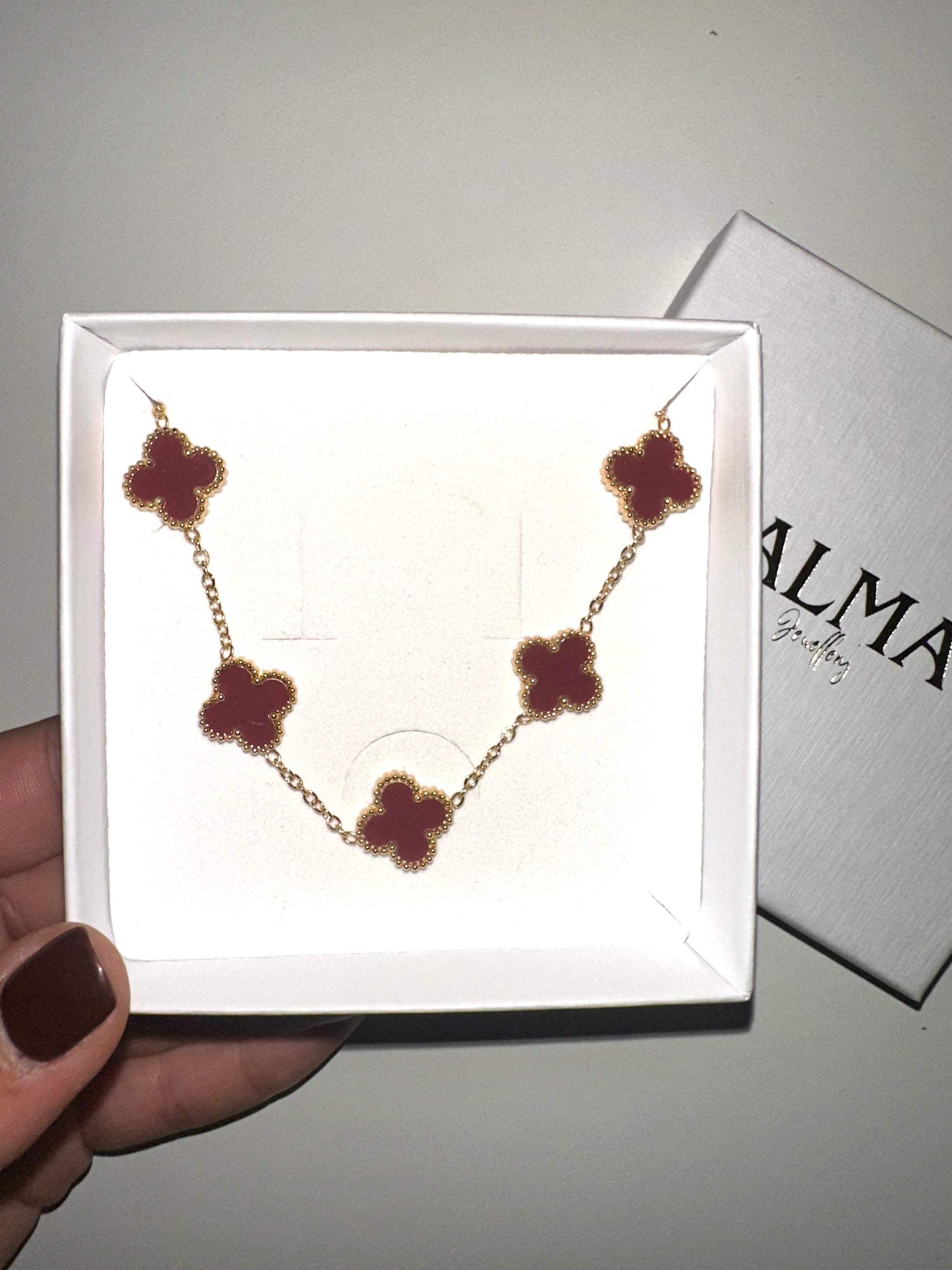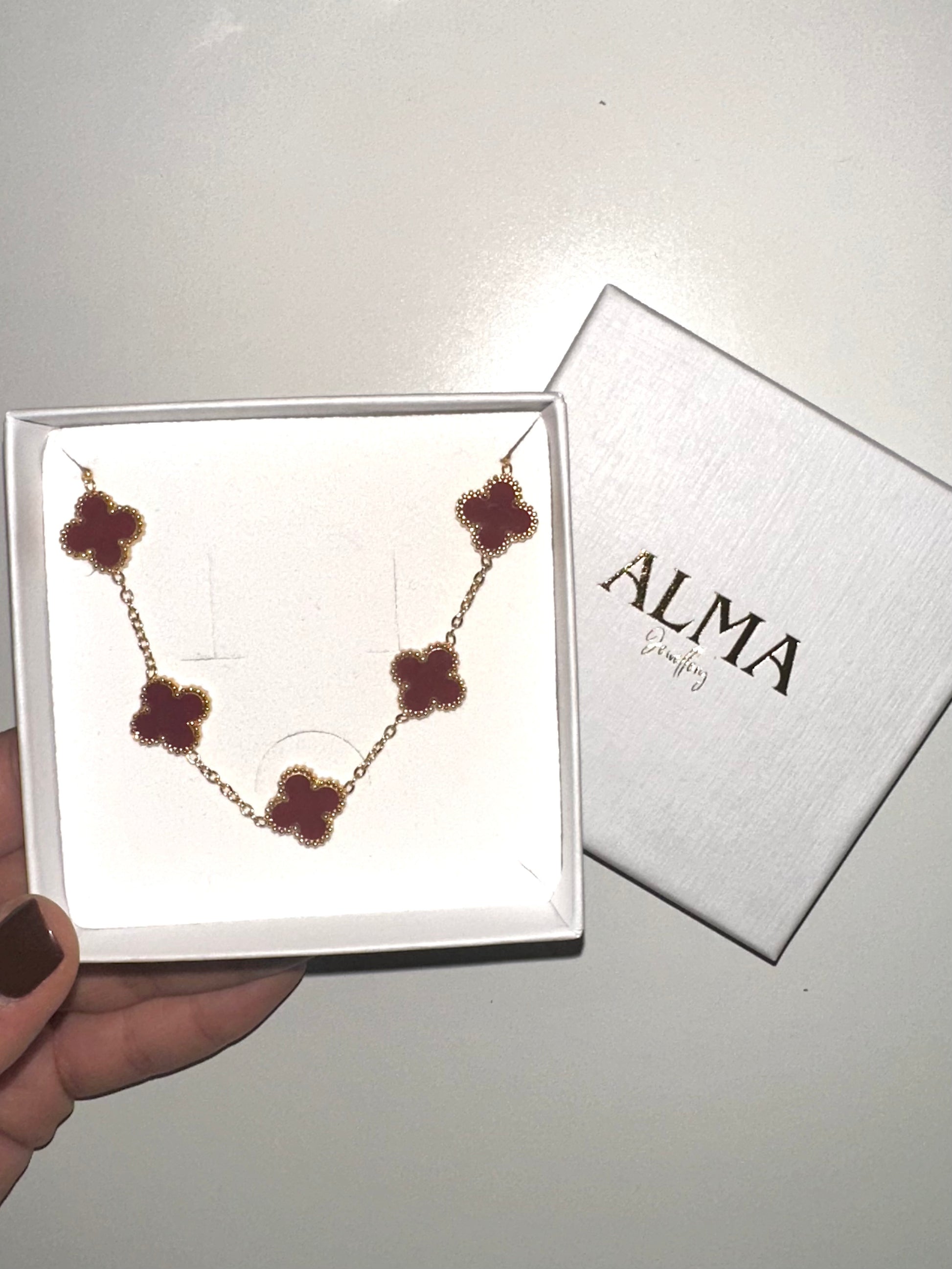 Raffiné et élégant, ce bracelet doré orné de trèfles bordeaux apporte une touche de couleur profonde et sophistiquée à votre poignet. Un essentiel chic et intemporel.
