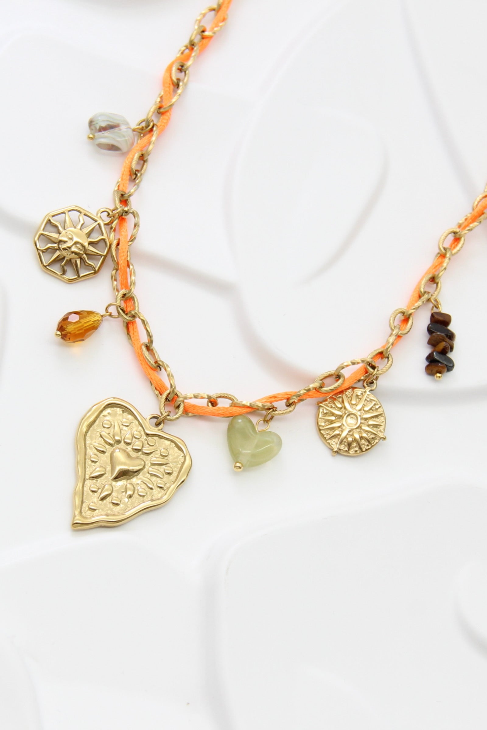 Ce collier tendance associe une chaîne dorée rehaussée d’un fil orange lumineux à une sélection de pendentifs raffinés. Il allie résistance et élégance. Son style bohème-chic en fait un accessoire parfait pour apporter une touche solaire et originale à vos tenues, de jour comme de nuit.