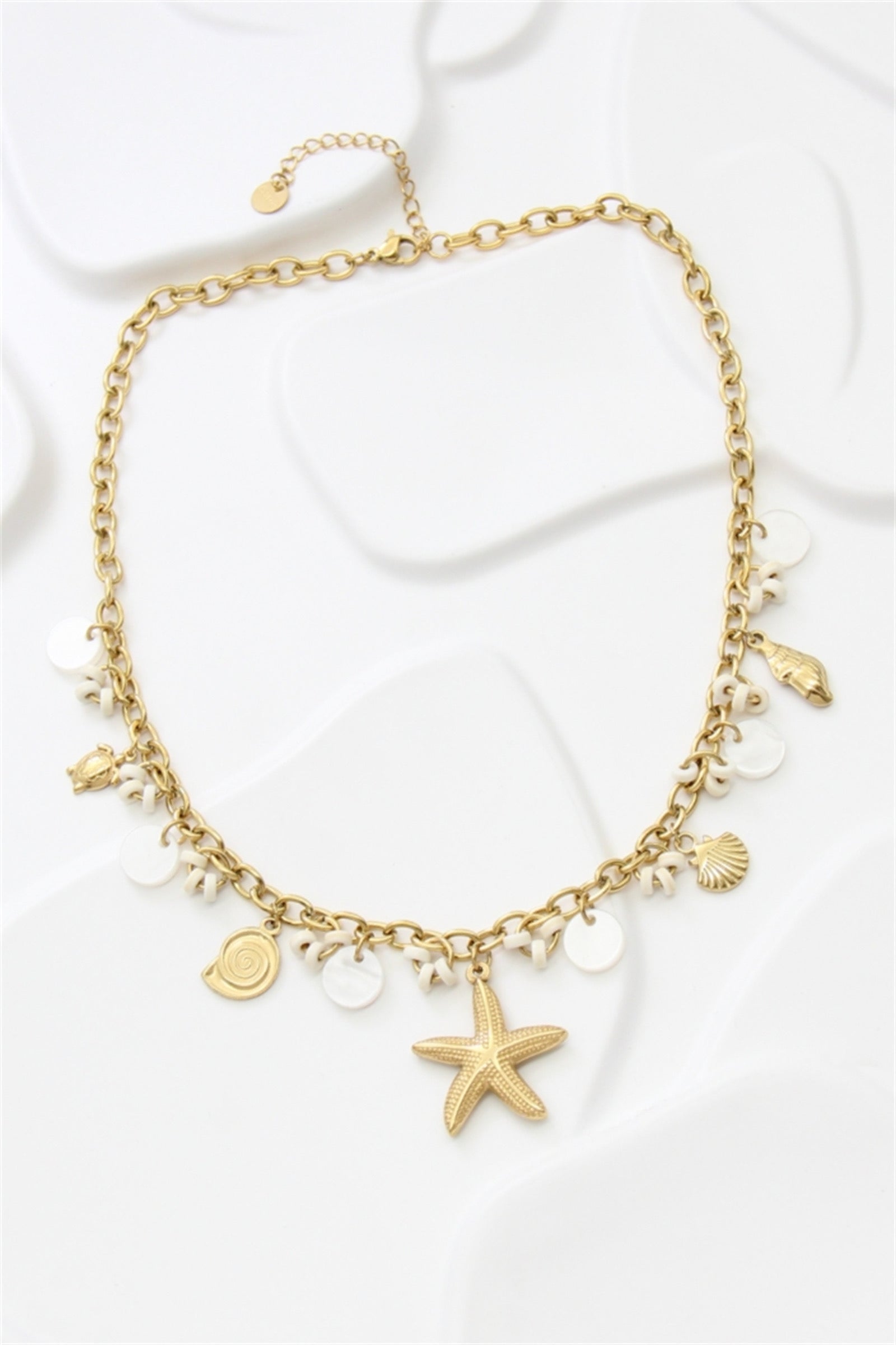 Ce collier doré en acier inoxydable s’inspire des trésors de la mer avec ses pendentifs délicats : étoile de mer, coquillage, spirale, tortue et nacres blanches. Résistant et raffiné, il apporte une touche estivale et lumineuse à vos tenues. Parfait pour un look chic et original en toute saison.